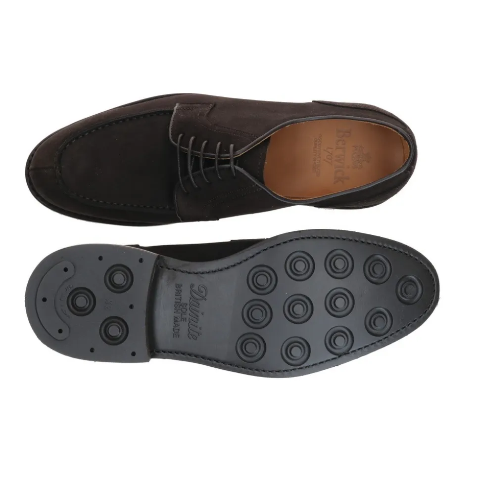 Blücher- oder Derby-Schuh mit Perlen am Vorderblatt und an der Spitze aus englischem Wildleder mit Dainite-Sohle, sehr abriebfest und feuchtigkeitsbeständig, und Sky-Wall für besseren Schutz vor Regen. All dies wird von unserer Goodyear-Welt-Manufaktur montiert und vollständig in unseren Einrichtungen in Almansa – Spanien – hergestellt.