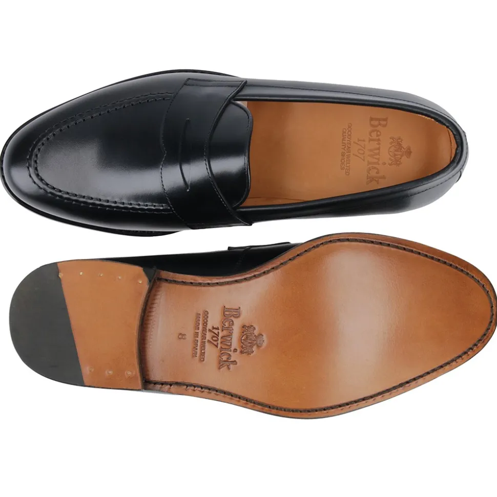 Schuh im Mokassin-Stil mit Obermaterial aus French Box Calf und einfacher Sohle. Dies ist eines der ikonischsten Modelle der Kollektion Berwick 1707, ein Design, das sich für alle Kleidungsstile eignet: klassisch, formell oder leger.