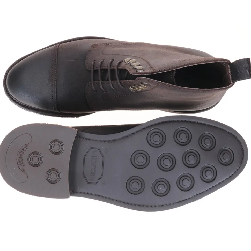 Blücher- oder Derby-Stiefel mit gerader Spitze aus geöltem, englisch gegerbtem Leder und leichter Vibram-Sohle, mit mikroporöser Zwischensohle und hohem Rahmen zum besseren Schutz vor Feuchtigkeit.