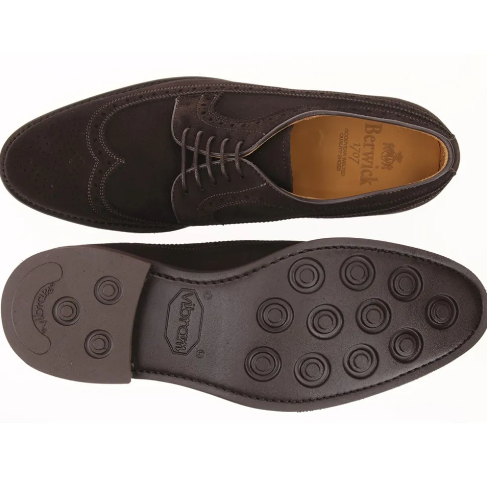 Schuh Typ Blúcher mit Vega- oder Wingtip-Zehenkappe, Feston und Kletterschuh aus Wildleder englischen Ursprungs, Zwischensohle aus mikroporösen Materialien und leichtem Gumlite-Gummiboden mit Knopfstollen des italienischen Herstellers Vibram. Ein paar Schuhe für einen formellen oder lässigen Offroad-Stil.