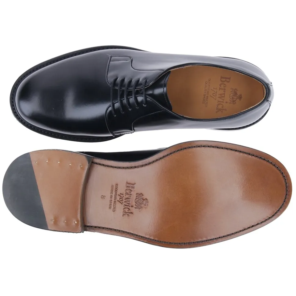 Schuh vom Typ Blúcher oder Derby mit glatter Klinge aus poliertem Hochglanzleder (Hi-Shine) mit spanischer Gerbung und doppelter Sohle. Komfortables Design für einen formellen oder informellen Stil.