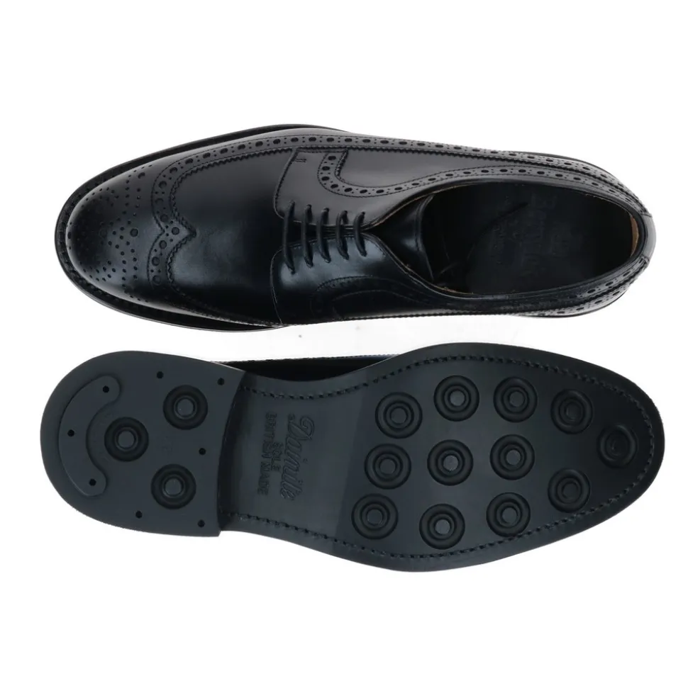 Blücher- oder Derby-Schuh mit Vega- oder Flügelspitzenkappe, Scalloped und Trepados aus French Box Calf, mikroporöser Zwischensohle und englischer Dainite-Sohle. Ein Schuh für einen formellen oder informellen und geländegängigen Stil.