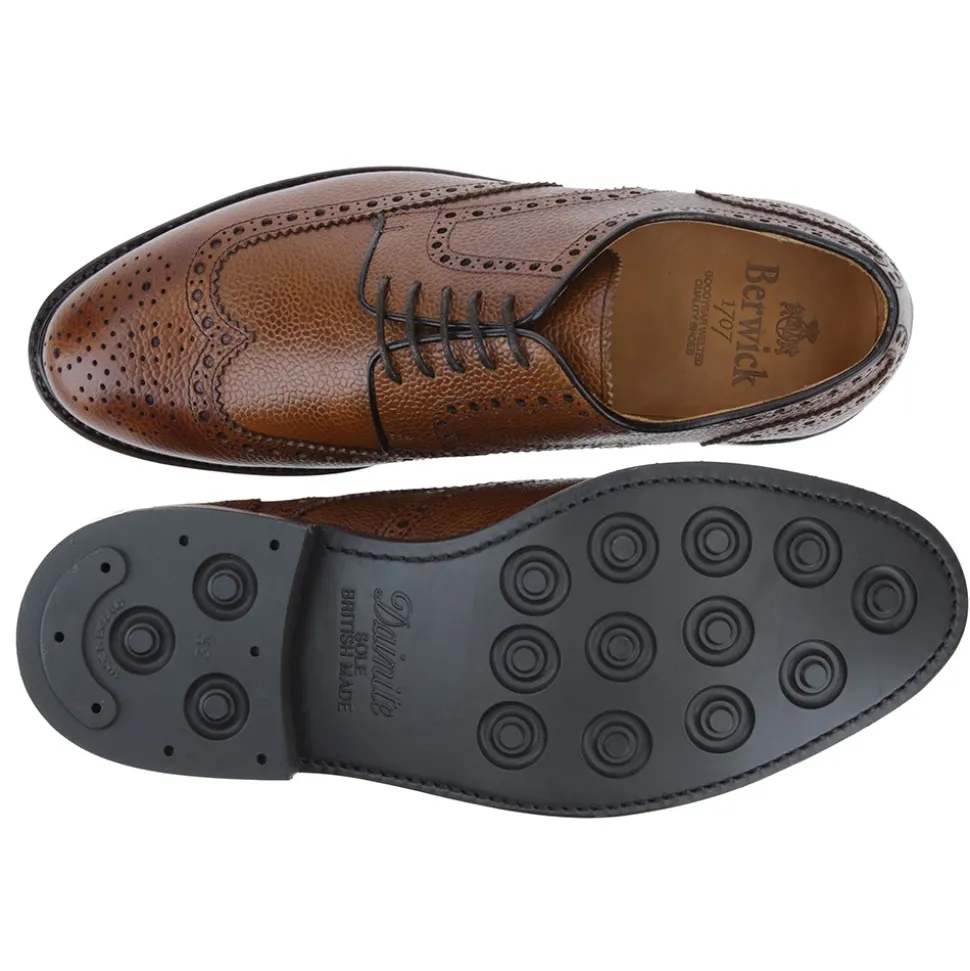 Blücher oder Derby-Typ Schuh mit Flügelspitze, scalloping und Klettern in Französisch gegerbten genarbten Kalb und Englisch Dainite Sohle, mit Leder Zwischensohle und Ferse gemacht. Diese strapazierfähige Sohle ist für alle Bedingungen geeignet und wird durch die Einbeziehung eines hohen Rahmens in die Konstruktion noch verbessert. Ein Modell, das zu allen Kleidungsstilen passt, ob formell oder leger.
