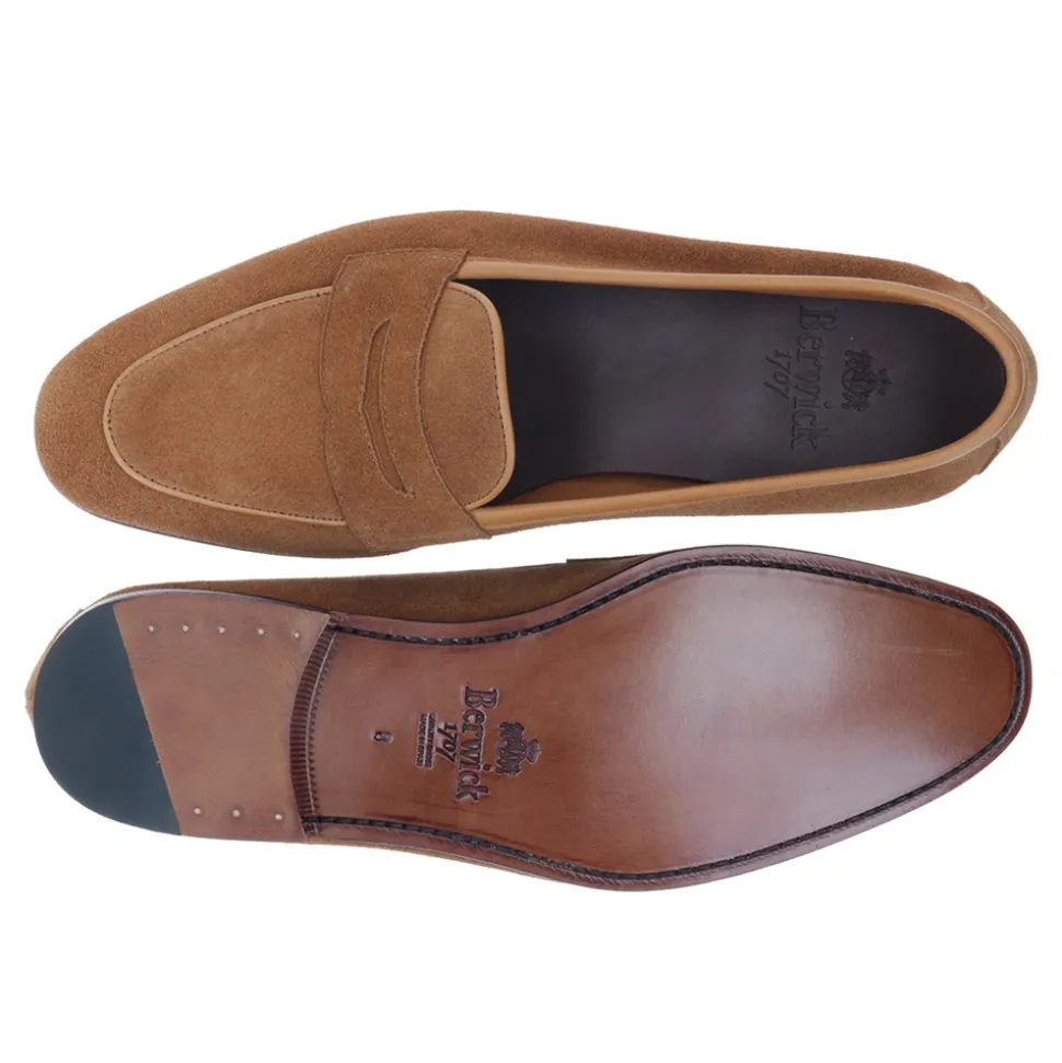 Unstrukturierter Loafer aus englischem Wildleder mit Details in der Narbung desselben Leders, ungefüttert und sehr flexibel.