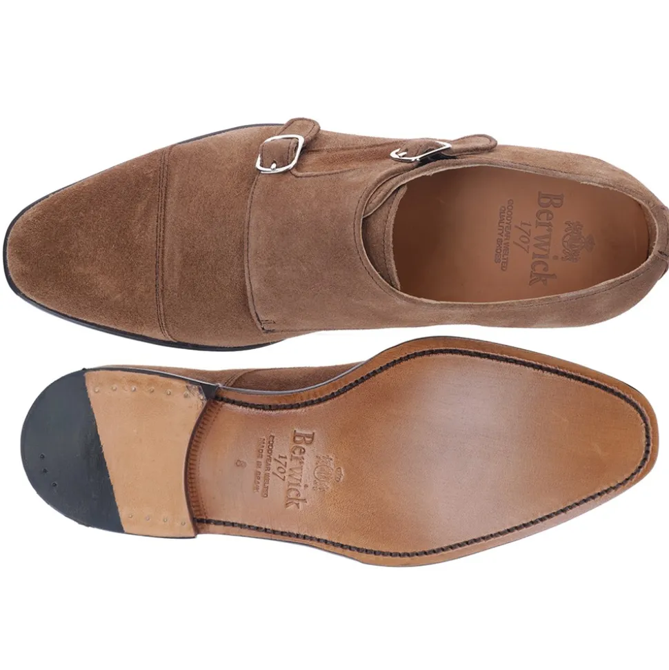 Doppelschnalle oder Doppelmonk-Schuh, mit gerader Spitze und Sohle aus englisch gegerbtem Wildleder. Eines der erfolgreichsten Modelle in unserer Kollektion, formal und modern.