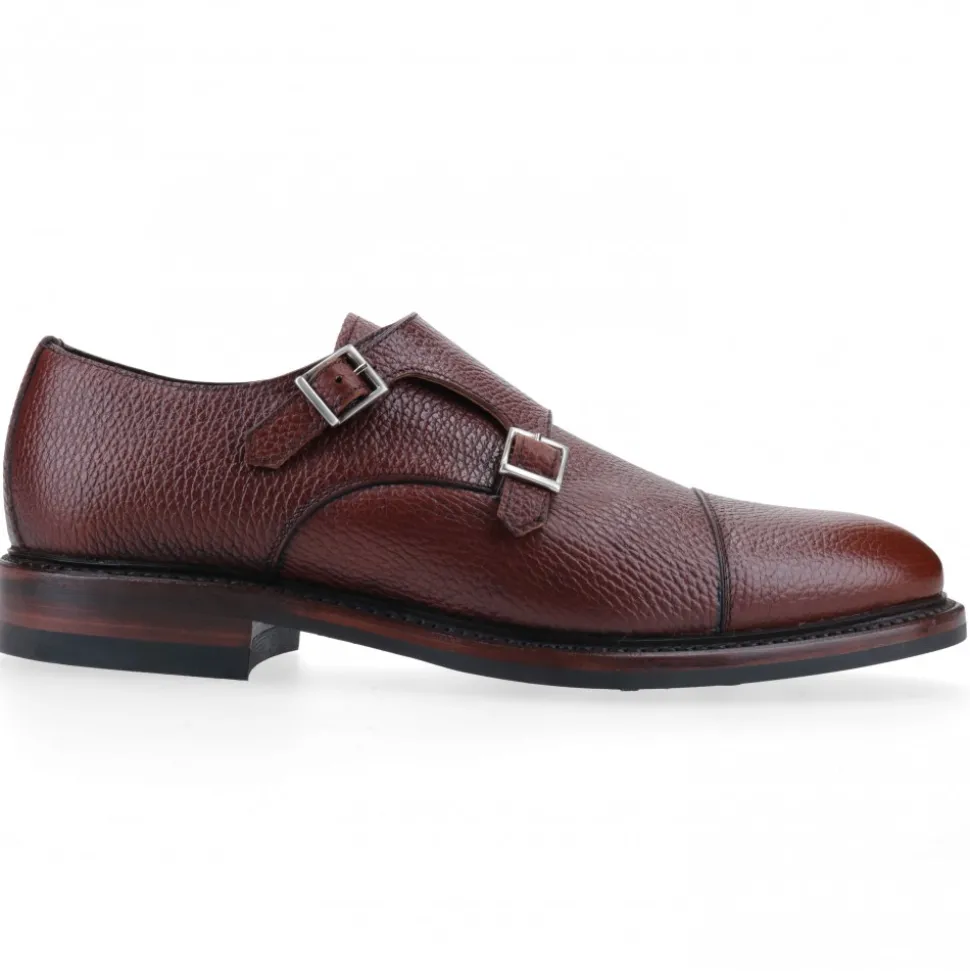 Doppelschnallenschuh mit gerader Zehenpartie aus französisch gegerbtem Scotch Grain und Dainitesohle, mit Sturmleiste für besseren Schutz vor Feuchtigkeit, in Goodyear Welt Konstruktion. Ein Schuh mit Stil, modern und geeignet für eine formelle und informelle Art, sich zu kleiden. Alle unsere Schuhe werden vollständig in Almansa – Spanien hergestellt.